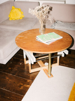 Info: Brutalistisch irgendwie, Überhänge aus Stahl und ein Balanceakt aus Holz. Die Verlagerung von Schwerpunkten aus der Mitte heraus führte zu Ausläufern und goldenen Stützen. Das Grau ist Teil eines 2000er Computertisches mit Tastaturauszug, die Tischplatte wurde jetzt schon drei Mal umgezogen, bis sie ihren schwebenden Platz gefunden hat.
