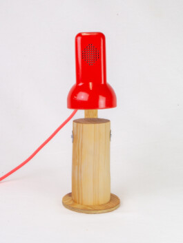 Material: Lampenschirm Metall und Kunststoff (Rot) Holz: Fichte/Tanne, Theaterlatte, Sperrholz, Dachblech,  DDR Schnurzwischenschalter, Gewebekabel.