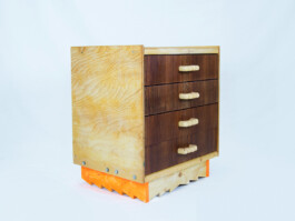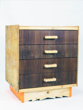 Material: Schubladen (Nussbaumfurnier), Kieferngriffe, Seekiefer und Sperrholz (geölt), Zickzackfuß orange lackiert und geölt.
